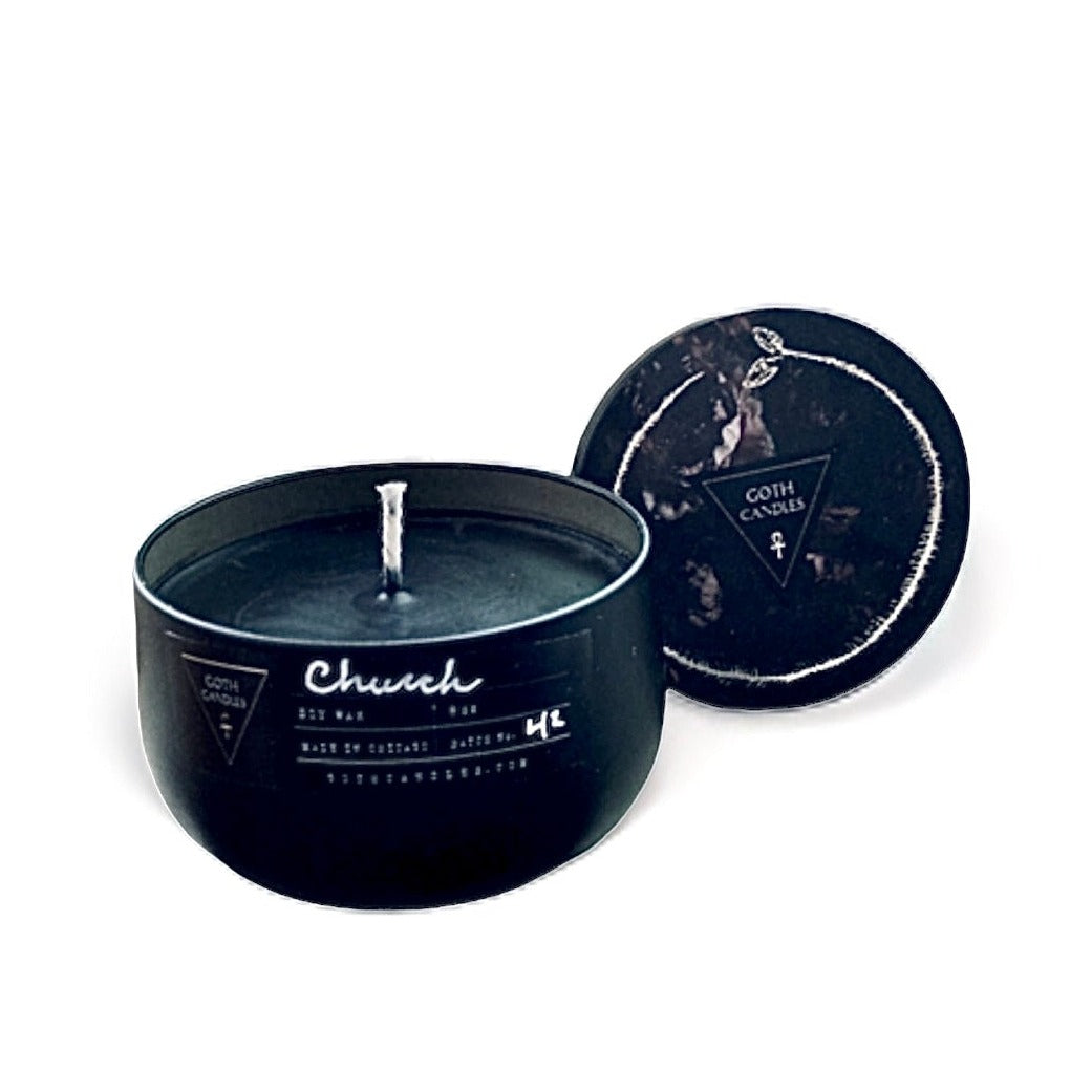 CHURCH | Frankincense and Myrrh Scent | Goth Candles | Black Premium Soy Wax | 8 oz Tin Vessel