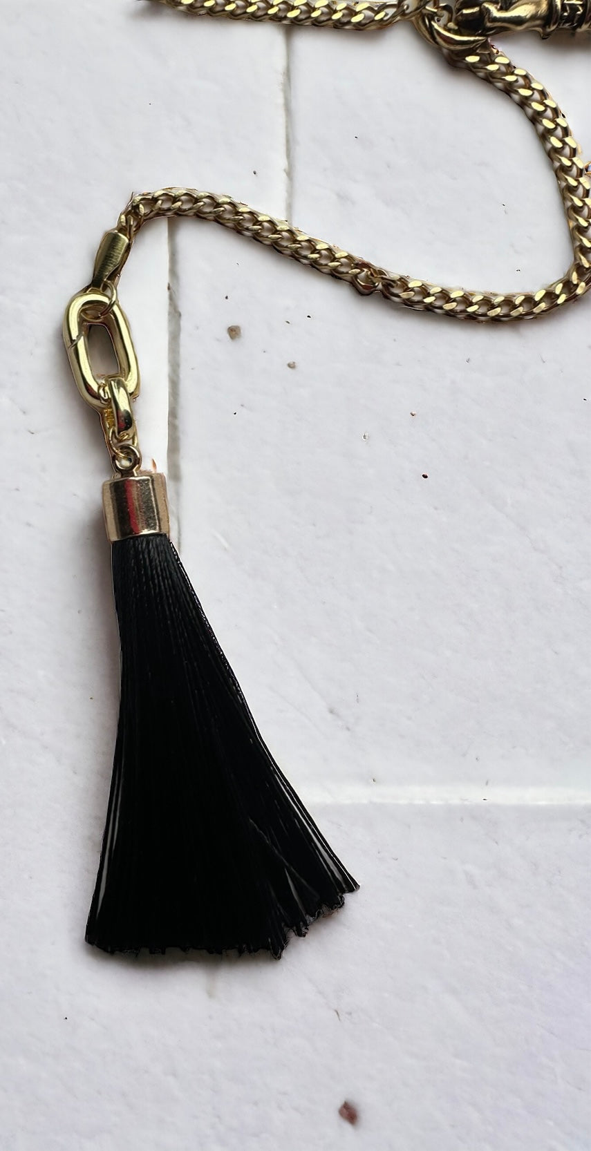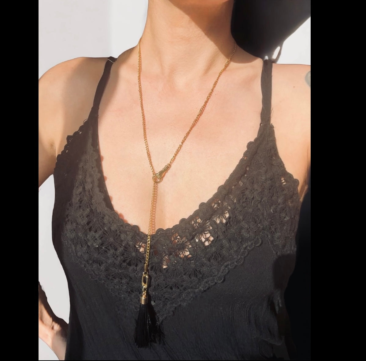 Adjustable lariat necklace with bronze charms and black tassel. Gold plated steel chain