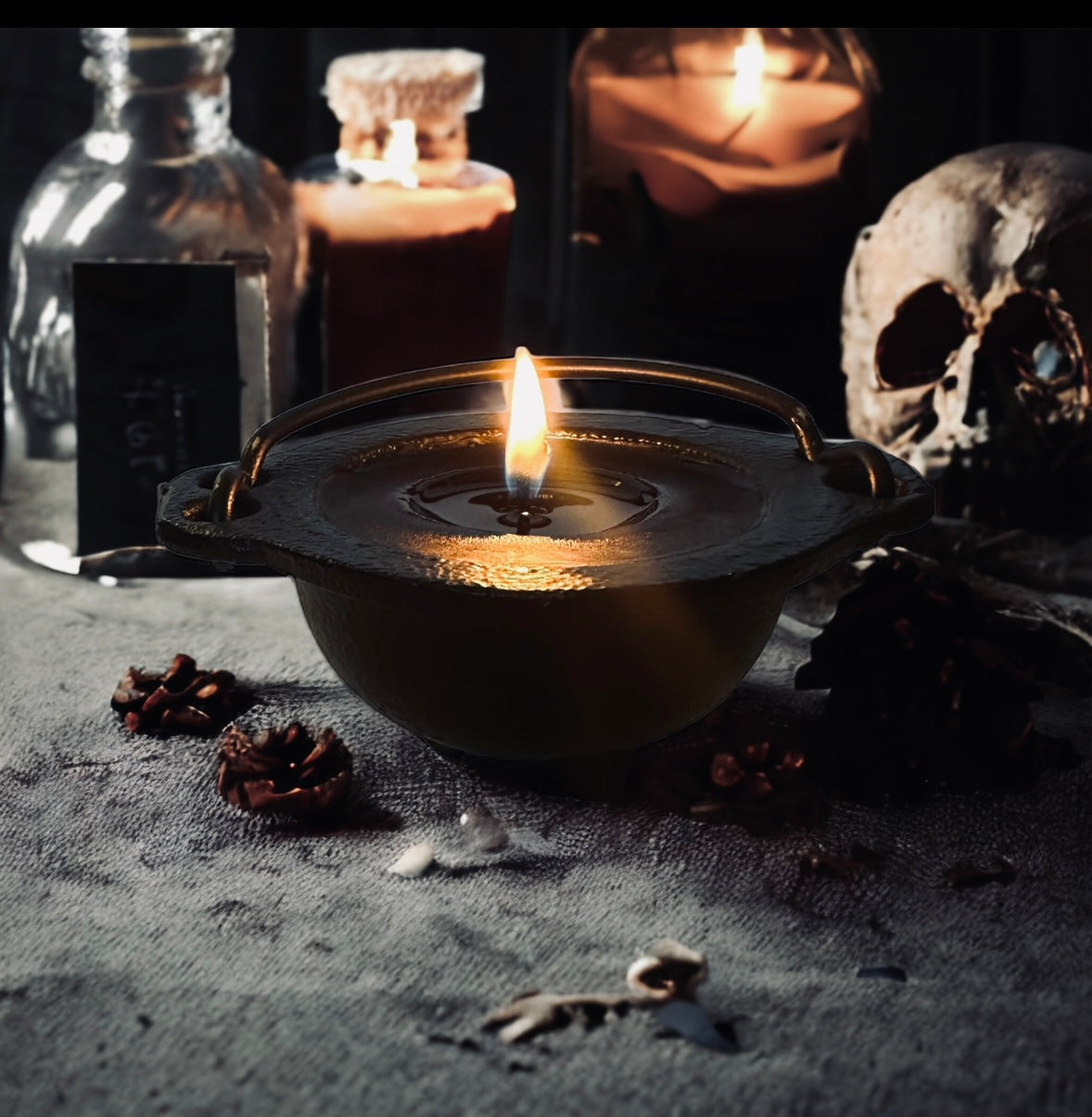 Behold, the SÉANCE candle ensconced within a diminutive cast iron cauldron, ready to whisk you away to an otherworldly séance, where the air is thick with the haunting aroma of incense and oud!
