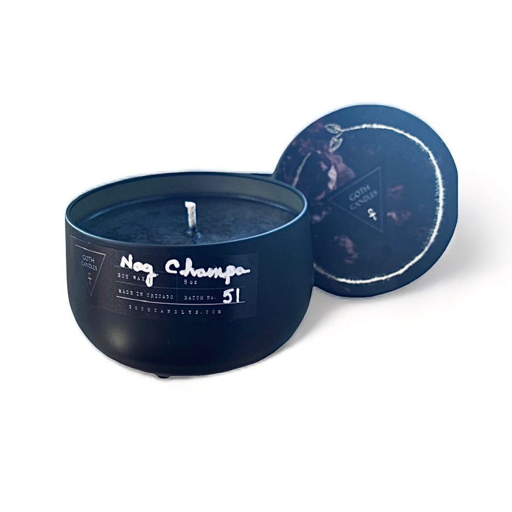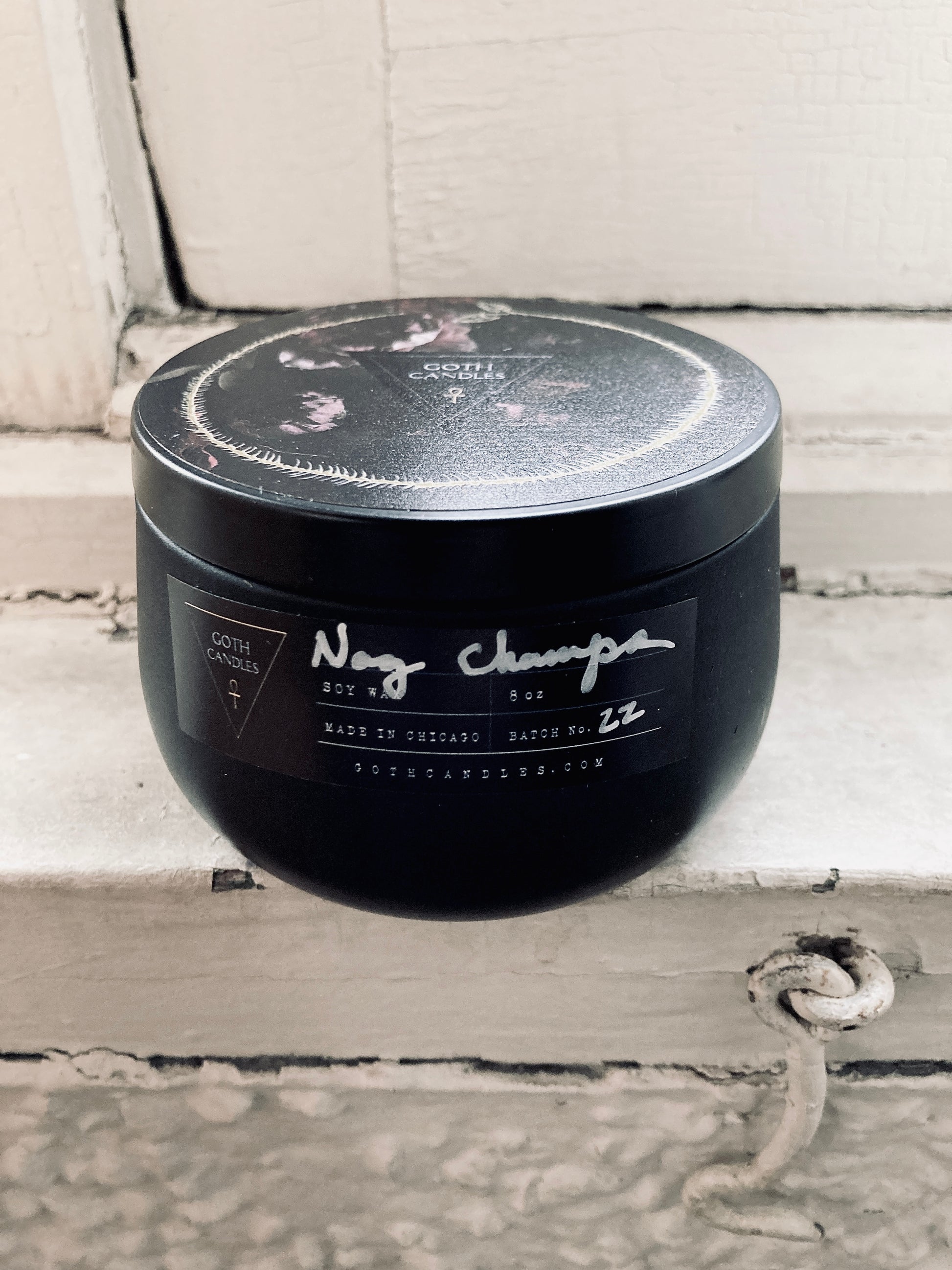 NAG CHAMPA | Goth Candles | 8oz Black and Gold Tin Vessel Black Goth Candle