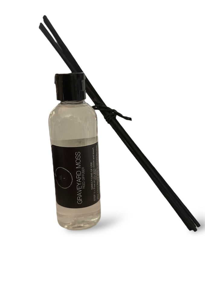 Reed oil diffuser refills. 4oz bottle in Graveyard Moss, Black Orchid,Nag Champa and Palo Santo. Includes 6 new reed sticks. (Will just include the oil and reed sticks, no glass jar)